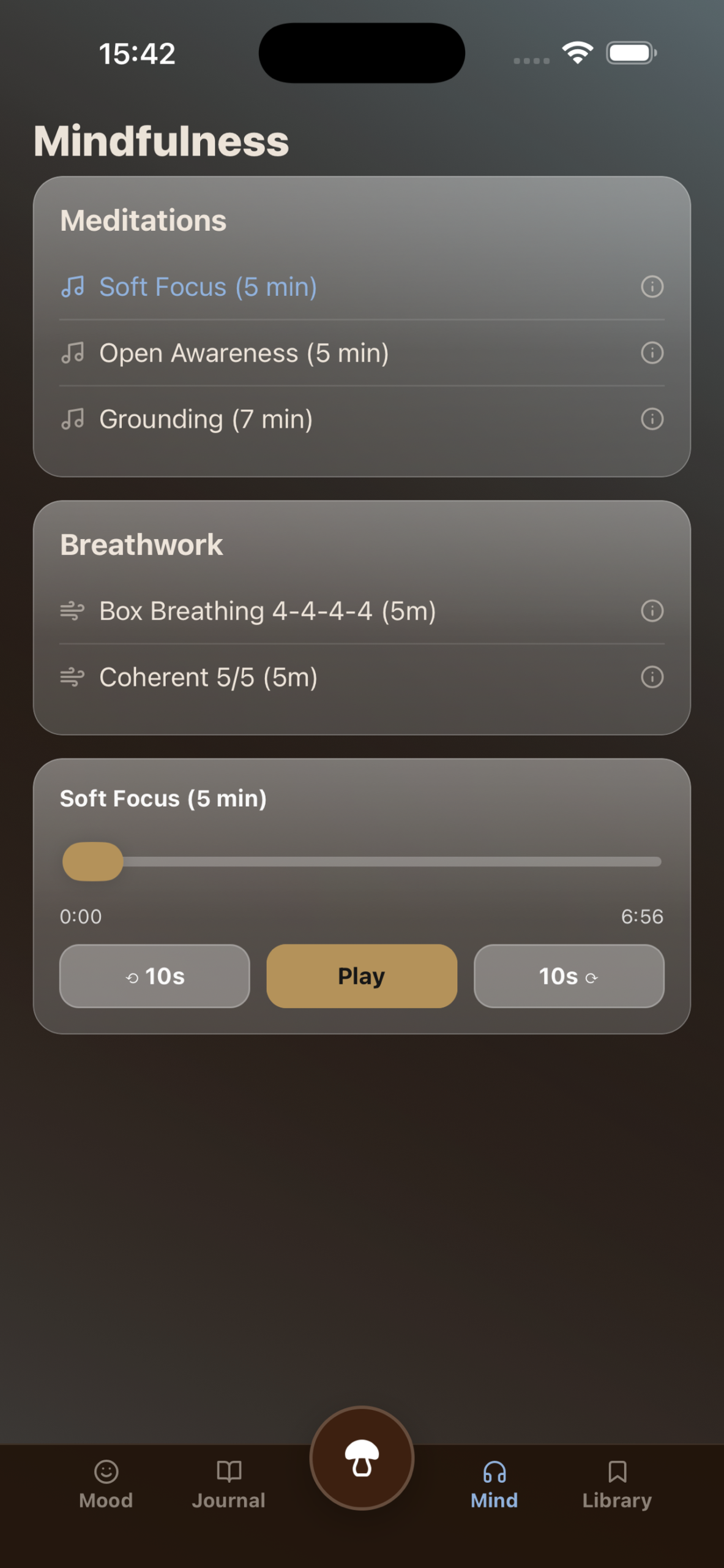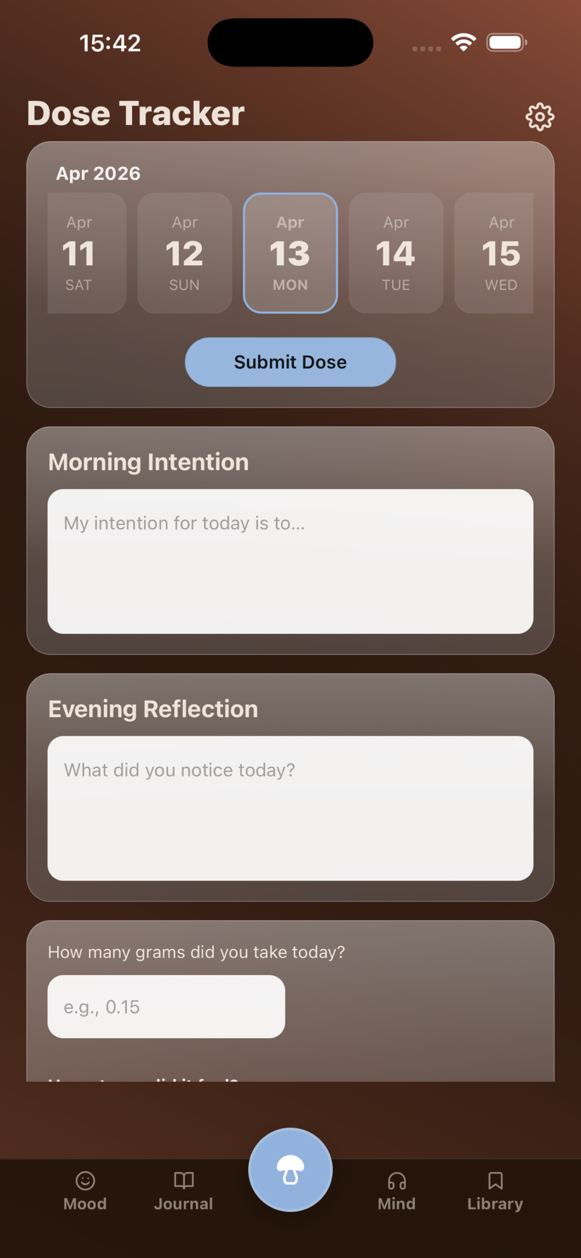Inside the app: dose-day guidance, mood and gratitude journaling, breathwork, and meditations – built to support consistency without turning your life into a dashboard.