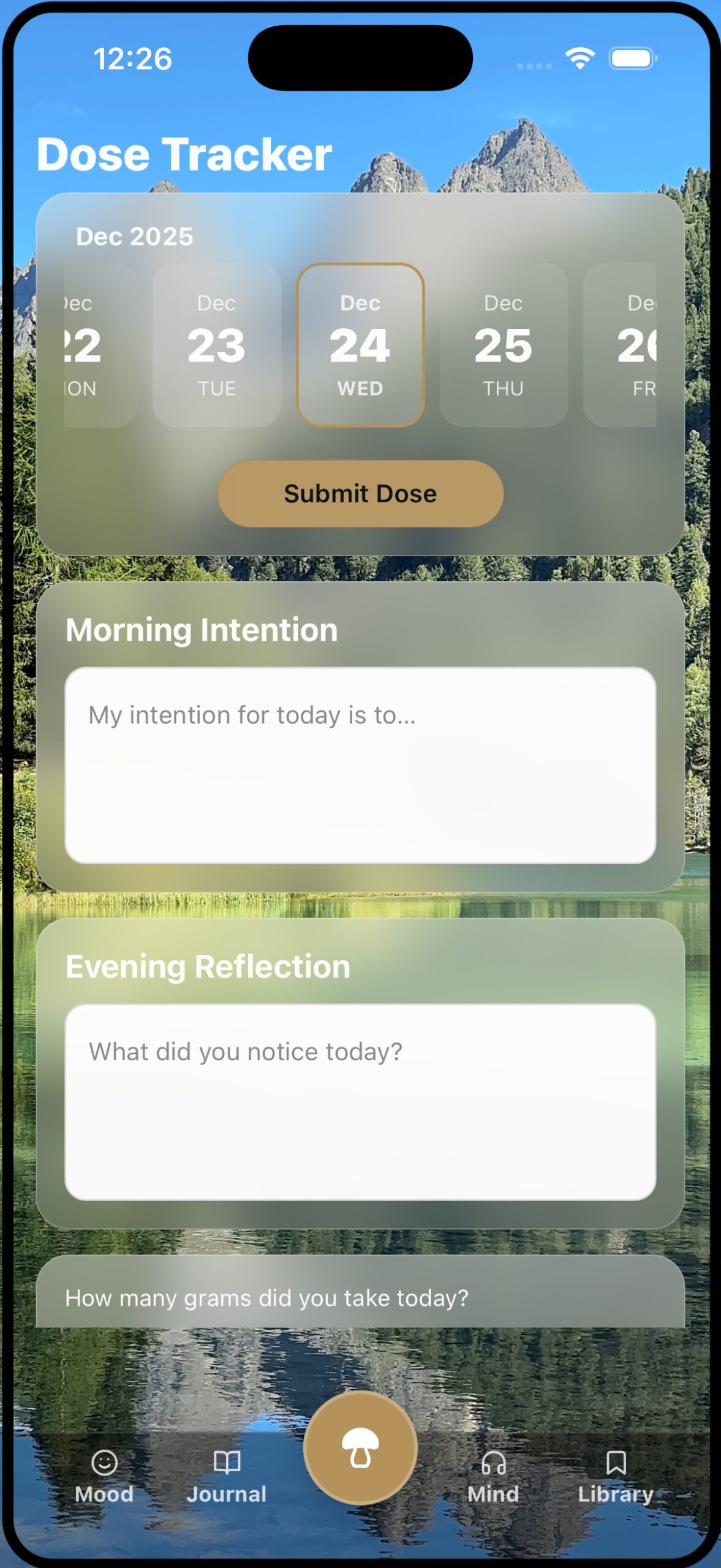 Inside the app: dose-day guidance, mood and gratitude journaling, breathwork, and meditations – built to support consistency without turning your life into a dashboard.